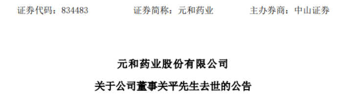 元和药业表示,公司董事、监事、高级管理人员及全体员工,对关平先生在任职期间的辛勤付出和卓越贡献致以最崇高的敬意和最衷心的感谢。对关平先生的去世表示沉痛哀悼和深切缅怀,并向关平先生的家属致以深切慰问。